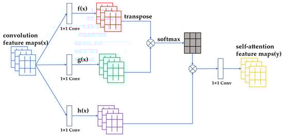 Due to not being able to learn deep features of TF images, the quality of generated data is often unsatisfactory in some models in the GAN. A self-attention mechanism (SA) added to the G and D can better extract different fault features in TF images and improve the generation quality of GANs [31]. An SA mechanism can effectively learn the global features in different samples instead of considering only local features and then accumulating them. In the SA mechanism, three 1 × 1 convolutional layers are utilized to produce three distinct sub-feature maps, denoted as f(x), g(x), and h(x), based on the input feature maps. Following this, the transposed convolution matrix of the sub-feature map f(x) is combined with g(x) to derive the respective attention weights. The transposition of the sub-feature map f(x) is multiplied by g(x) to obtain the corresponding attention weights. After processing these through the Softmax activation function, a new attention map is obtained. Finally, the matrix is multiplied with h(x) and a 1 × 1 convolutional block, yielding the final SA feature map. The detailed structure diagram is shown in Figure 2 as follows.