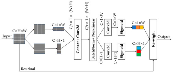 where the notation [ , ] represents a series operation performed along the spatial dimension, and the symbol represents a nonlinear activation function. The intermediate feature mapping encodes spatial information in both the horizontal and vertical directions. The reduction rate r is chosen as 32 to reduce the computational overhead. Additionally, two separate 1 × 1 convolutional transforms, and , are applied to convert and into tensors with the same number of channels as , which can be obtained as follows in Equations (14) and (15), respectively: