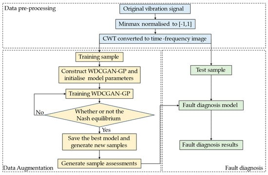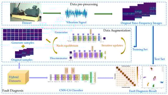 This article presents a novel fault diagnosis method in cases of S&I data. The proposed approach utilizes WDCGAN-GP for data augmentation. The enhanced sample data are subsequently employed for fault diagnoses using CNN-CA. A detailed structure diagram of overall process is shown in Figure 4.