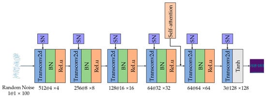 The input of the G is a 100-dimensional Gaussian random noise vector z, which is used to generate a 128 × 128 output image. The transpose convolution modules in the G utilize SN for weight normalization. The SA is introduced between the fourth and fifth layers of the model to improve the quality of generated images. Finally, the output is limited to the range of [−1, 1] using the Tanh activation function. Batch normalization (BN) is applied after each layer of the G network to accelerate training speed and prevent overfitting. A detailed diagram of the G’s structure and its parameters is shown in Figure 6.