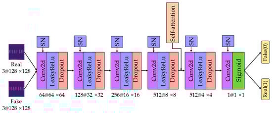 The inputs of the D are the original TF image samples and the generated TF image samples. The outputs of the D are obtained using the sigmoid activation function, which provides true or false discrimination results. This allows the D to determine whether the input samples are original or generated samples. The D contains modules consisting of 5 layers of convolution and LeakyReLU function, which enable the D to discriminate the types of samples more accurately. At the same time, dropout is added after the activation function to prevent the model from overfitting. SN is used in the network to perform the weight normalization operation for each convolution module. The SA is added between the fourth and fifth layers of the D to enhance its discriminative capability. A detailed diagram of the D’s structure and its parameters is shown in Figure 7.