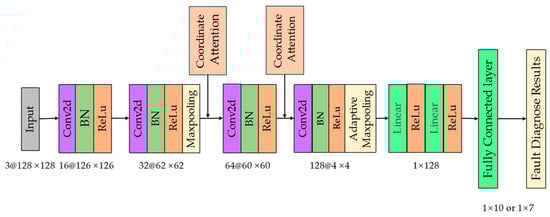 Our proposed method uses CNN-CA as a fault diagnosis model, in which the input is original S&I dataset or a mixed dataset consisting of the generated samples and the original S&I dataset. The CNN-CA contains a total of four convolutional layers, each of which containing a 3 × 3 convolutional module as well as the BN and ReLU activation functions. The model adds CA in the second layer and the third layer of the underlying CNN after the second and third layers. Finally, the classification is performed using the linear layer and Softmax activation function. The batch size is set to 32. Using Adam optimizer and a learning rate of 0.001, the epoch rounds are set to 30. The detailed structural diagram of CNN-CA and its parameters is shown in Figure 9.