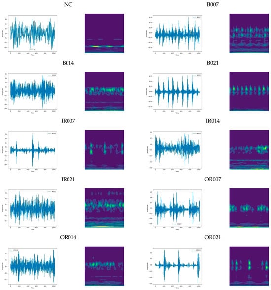 Different time domain images and corresponding TF images of bearings in the CWRU dataset (0 HP).
