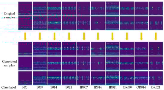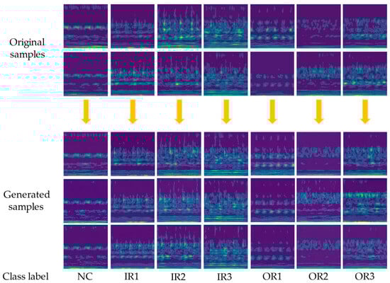 Figure 4 contains three main parts: data preprocessing, data augmentation, and fault diagnosis. Firstly, in the data preprocessing part, the original vibration signals are min–max normalized. The distribution of the data is controlled to be between [−1, 1], which can better highlight the characteristics of the faulty data points [35]. The vibration signals are transformed into TF images with dimensions of 128 × 128 through CWT. The transformed TF images are divided into training samples and testing samples based on the quantity. The training samples are used as the training data for the generation model, while the testing samples are used for testing in the fault diagnosis part.