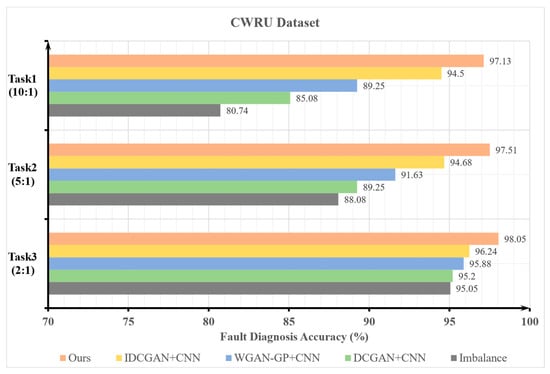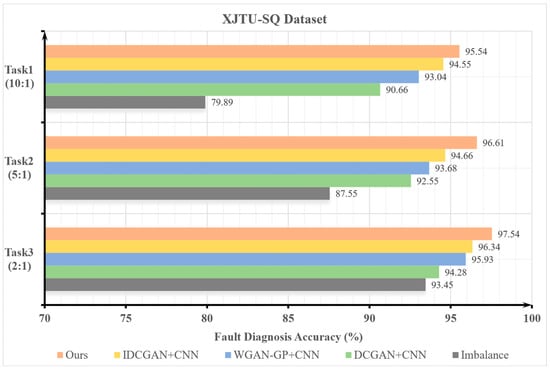 According to Table 2, we obtained three different proportions of the S&I experimental tasks as well as one sample-balanced experimental task. In the subsequent experiments, we added the samples generated by the WDCGAN-GP to the datasets in the three imbalanced experimental tasks to form a newly balanced hybrid dataset. Finally, we combined the CNN-CA models to perform fault diagnoses.