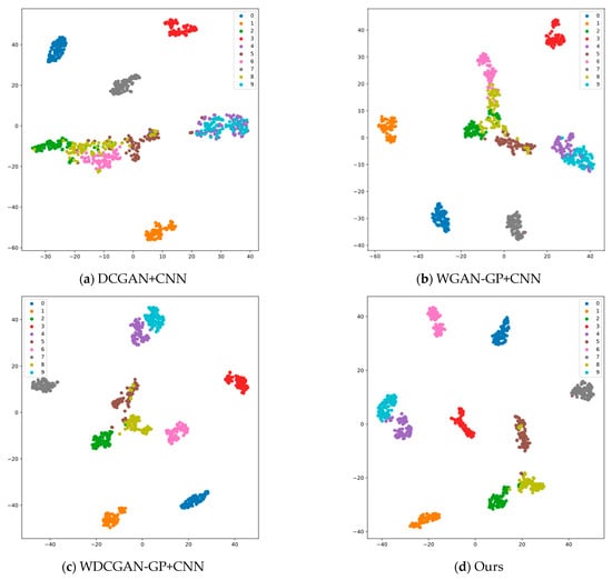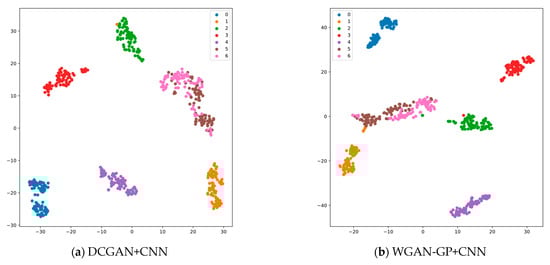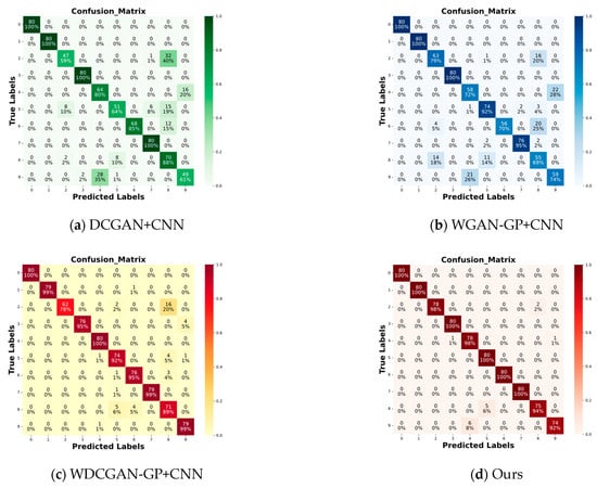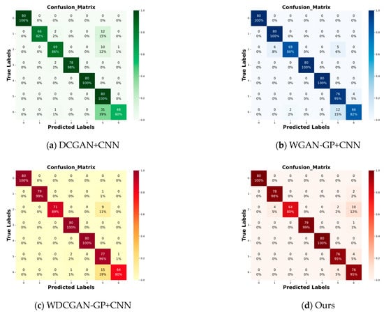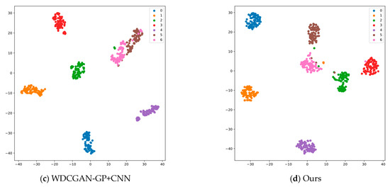 By comparing the evaluation results using the SSIM and FID metrics in Table 5 above, it can be found that the proposed WDCGAN-GP shows improvements in terms of the quality of the generation of different fault categories compared to that of both the DCGAN and WGAN-GP. In the TF images, different categories of fault signals are represented by distinct regions. The generated samples tend to have more light-colored regions when based on TF images, such as the fault samples labelled as No. 2 and No. 3. They also have lower SSIM values compared to the rest of the categories because although the model can learn the features of the light-colored regions, the light-colored regions in the generated samples may be biased from the original images, which is the same conclusion as that for Case 1.