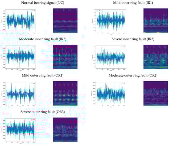 The time domain images and corresponding CWT TF images of the seven different bearing vibration signals in the XJTU-SQ bearing dataset are shown in Figure 17. Each set of images is accompanied by corresponding fault information and labels.