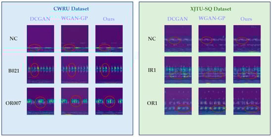 The proposed method is validated using two distinct bearing datasets. In both cases, the WDCGAN-GP successfully generates higher-quality samples by learning from the original TF images. To highlight the advantages of the proposed model and facilitate observations, we selected three categories with clear periodicity in the vibration signal from each of the two datasets. The differences between the samples generated by the different models are marked with red circles. It is worth noting that the samples compared are randomly selected generated samples from the corresponding categories. A comparison of the generated samples from the different models is shown in Figure 22.