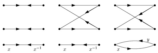 A graphoid (or a general digraph) is an ordered 4-tuple , where is a set of vertices, is a set of darts, and is a function (bd stands for “border”) that assigns to each dart an ordered pair of (not necessarily distinct) vertices , its initial vertex , and its terminal vertex . Usually, we write . Finally, −1: is a partial involution acting on a subset of darts such that and . A dart without an inverse is either a directed edge (a directed link) when , or a directed loop when . A pair of inverse darts and is called an undirected edge when , an unoriented loop when and , and a semiedge when and . A graphoid in which every dart has an inverse is a graph, whereas when no dart has an inverse, it is a (genuine) digraph. The underlying graph of X is the graph obtained by adjoining a formal inverse to each dart without an inverse. The span is a digraph that has the same sets of vertices and darts as X and the same functions beg and , while the involution −1 is the empty function. An edge in X becomes two “oppositely” directed links in ; an undirected loop becomes a pair of directed loops, while a semiedge becomes a directed loop. The spanning digraph of preferred orientation arising from X is obtained by including in its dart set all darts from X that have no inverse, exactly one of the darts from each pair of distinct darts that are inverse of each other, and all semiedges.