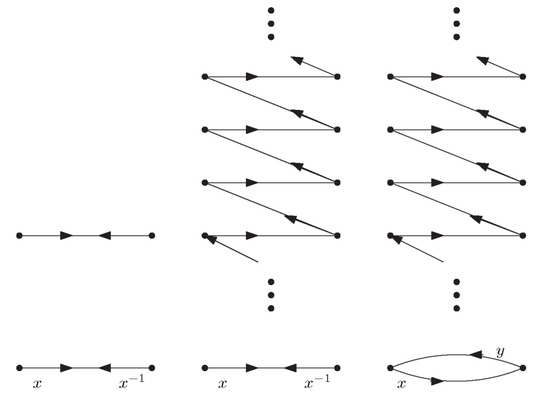 This defines an equivalence relation. If a walk W contains a subsequence of the from or of the form , which means travelling forth and back along a dart (or a dart and its inverse, if it exists), we can delete it. This is called an elementary reduction. A sequence of elementary reductions until no further reductions are possible leads to a reduced walk .