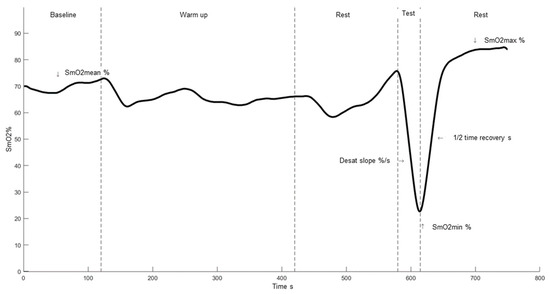 Graphical example of the time course of SmO2 variables from the resting values during warm-up, test, and rest gathered from the vastus lateralis right muscle.