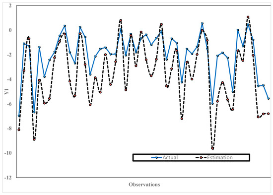Hereinafter, we obtained the plots of estimated model values versus predictor (observation) values for every response together with the plots of their actual values. The plots of estimated model values versus predictor (observation) values for the first response together with the plots of actual values of the first response are presented in Figure 1. The plots of estimated model values versus predictor (observation) values for the second response together with the plots of actual values of the second response are presented in Figure 2. The plots of estimated model values versus predictor (observation) values for the third response together with the plots of actual values of the third response are presented in Figure 3.