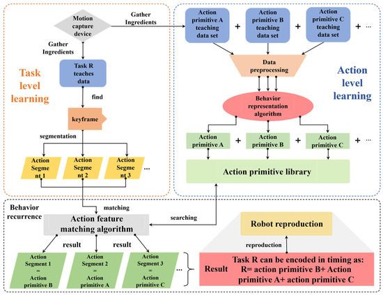 At the motion level, GMMs are used to represent the trajectory data of taught actions, formalizing human behaviors as mathematical models, and forming a library of motion primitives. The robot is assisted to accomplish the critical step of breaking down a “task” into “actions” at the task level by using a “keyframe marker” method. Finally, we propose a new action feature matching algorithm to enable the robot to achieve behavioral understanding and reproduction.