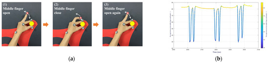 - Task Level Learning: Since an operating task is typically composed of multiple basic actions. One of the challenges in demonstration learning is figuring out how to segment complex tasks into reasonable action segments [45,46]. Currently, task segmentation algorithms rarely achieve satisfactory processing results. Therefore, this article proposes the following solution: introducing human decision making into task-level learning. The task data is segmented during the acquisition by manually inserting keyframe markers into the task, which means that the system just needs to represent the ordered combination of which action segments correspond to a task. The keyframe marker process is as follows: the demonstrator marks a keyframe by closing their middle finger from open to closed and then back to open. The demonstration process of keyframe markers is shown in Figure 2a, and Figure 2b shows the change in the angle between the middle finger and thumb.