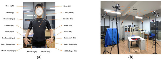 (a) Light marker paste position diagram; (b) motion capture device layout diagram.