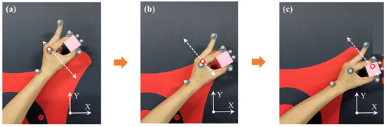 Example: There are two cylinders and two cubes in the middle of the desktop. Now, we need to put the cylinders on the top left corner of the desktop and the cubes on the top right corner. During the demonstration of the classification operation, first, maintain the angle between the middle finger and the thumb at a constant angle (80 ± 10)°, lift cylinder A in a straight-line motion, then swing the middle finger to insert a “key frame”, as shown in Figure 2a, and move cylinder A towards the top left corner in a straight-line motion. After the movement is completed, insert another “key frame”. Finally, place cylinder A on the desktop in a straight-line motion and swing the middle finger to insert a “key frame”. This completes the movement of cylinder A. Similarly, move cube B to the designated position in an arcuate motion, and after the movement is completed, swing the middle finger to insert a “key frame”. Finally, using both hands to move the remaining C and D simultaneously, the teaching process for C is like A, and the teaching process for D is like B.
