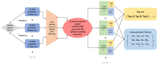 The purpose of the LFD at the action level is to enable the robot to understand the underlying characteristics of each action primitive. In this topic, we use GMM to complete this step. Firstly, we perform filtering on the demonstration trajectories. Then, we fit these trajectories with multiple Gaussian distributions using ellipses. Finally, we select the optimal path from the generalized trajectories as the reference standard for each action primitive. The implementation block diagram is shown in Figure 6. Following the action-level demonstration learning, we create an action primitive library in which the attributes of every primitive can be expressed as particular mathematical models. Next, we will introduce the research steps of demonstration learning at the action level in detail.