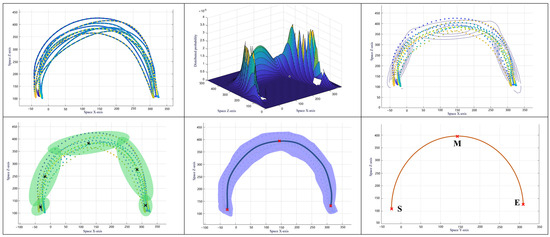 The K-means clustering algorithm is utilized to obtain a more ideal initial value based on the maximum likelihood algorithm [47]. The mentioned iterative algorithm is then used to complete the parameter estimation. In addition, in this paper, the number of Gaussian kernels K is manually selected according to the actual fitting situation. After calculating the model parameters, further regression processing must be performed by using the GMR algorithm. Its function is to estimate the spatial position , corresponding to a time step sequence in trajectory X based on the GMM. The formulas for the expectation and variance of distribution are Formulas (8) and (9).
