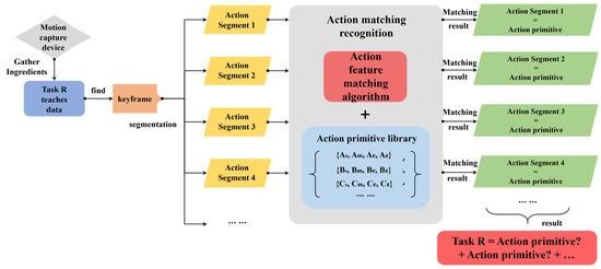The purpose of LFD at the task level is to enable the robot to recognize complex human manipulation tasks, segment the tasks into more fundamental action primitives, and use a matching algorithm to find the most suitable action primitives from the library of action primitives to describe these action primitives. A task can then be represented in temporal sequence as a set of action primitives. Finally, the robot’s dual arms are used to replicate the human demonstration task in the form of a PVT instruction set. The implementation diagram of demonstration learning at the task level is shown in Figure 8.