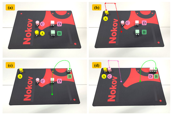 Demonstration process of the desktop item classification operation task (a) initial state; (b) move A; (c) move B; (d) move C and D simultaneously.