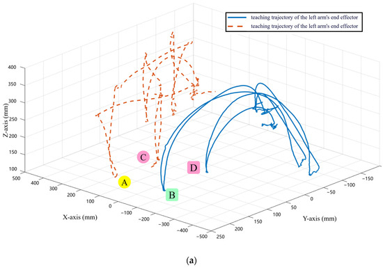 During the experiment, the movement process of the demonstrator is shown in Figure 13a. Simultaneously, the motion capture system collects the position and attitude information of the demonstrator at the beginning and end of the movement, obtaining the teaching trajectory, as shown in Table 2.