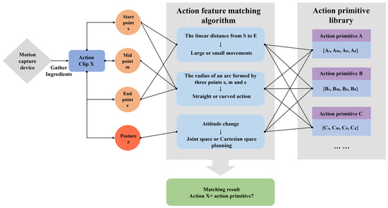 After training and organizing using GMM and GMR algorithms, we constructed an action primitive library, whose members are shown in Table 1. Taking action primitive A as an example, it can be characterized by the following four parameters: the spatial position of the start point , the spatial position of the midpoint , the spatial position of the endpoint , and the arm end pose . Similarly, the action segment X to be matched also has these four parameters. The execution flow of the feature matching algorithm is as follows: