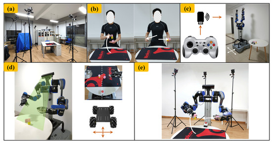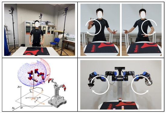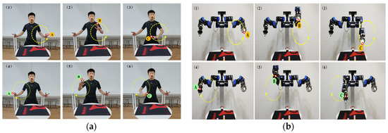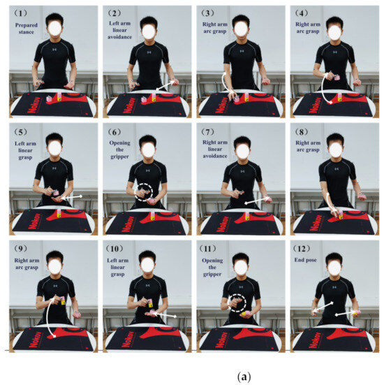 In this experiment, the demonstrator demonstrates a picking operation for desktop items, and the motion capture system records the demonstrator’s behavior. Then, the backend demonstration learning system can interpret the picking operation as a set of action primitives. Finally, the humanoid dual-arm robot executes these action primitives one by one to complete the learning and reproduction of human demonstration data at the task level. The experiment is divided into the following six parts: preparation, demonstration and data processing, robot movement, visual recognition, robotic arm trajectory planning, and experiments, as shown in Figure 16.