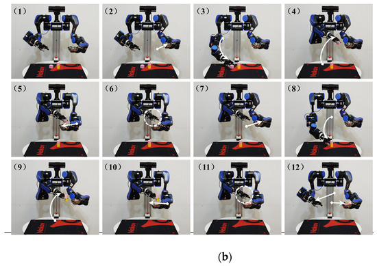 The planned trajectory data are converted into PVT data that can be executed by the joint modules of the reducer, and the physical robot is driven to replicate the demonstration operation task demonstrated by the demonstrator, as shown in Figure 17b. Through the combined operation of the above steps, the cubic and cylindrical blocks on the desktop are picked up by the right arm’s gripper and placed into the container at the end of the left arm. During the experiment, the robotic arms operate smoothly without any interference, and the picking operations are successfully completed.