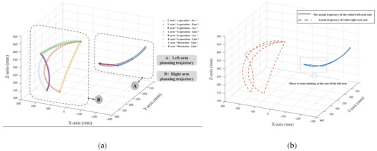 (a) Track planning results of item picking experiment; (b) actual running trajectory of the robot’s two arms.