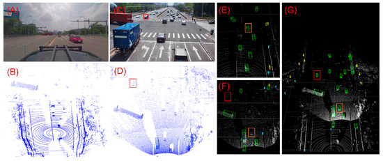 Visualization of target detection results. (A) Image collected by the vehicle-side camera. (B) Point cloud collected by the vehicle-side LiDAR. (C) Image collected by the roadside camera. (D) Point cloud collected by the roadside LiDAR. (E) Vehicle-side point cloud detection result. (F) Roadside point cloud detection result. (G) Feature fusion detection result. The red boxes and orange boxes indicate vehicles.