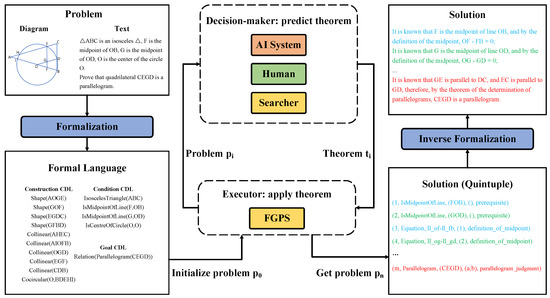 FGPS can run in two modes: interactive and automated. As shown in Figure 1, in the interactive mode, an external decision-maker is required to provide the next theorem information. FGPS applies the theorem and updates the problem status. When the external decision-maker is a human, FGPS can serve as an interactive proof assistant to help humans verify the proof process; when the decision-maker is an AI, it can conveniently implement heuristic search methods. When FGPS operates in automatic mode, it can use various methods (forward search, backward search, and heuristic search) combined with various search strategies (breadth-first search, depth-first search, random search, and random beam search) to solve problems, automatically removing redundant theorems after achieving the solution goal.