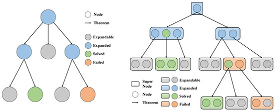 Backward search (BW), on the other hand, begins with the problem-solving goal, expands it into multiple sub-goals, and repeats this process until all sub-goals are resolved. The search process involves the construction of a search tree, with nodes representing sub-goals, supernodes representing sets of sub-goals, and edges representing theorems, as illustrated in Figure 3. The description of the backward search algorithm is provided in Algorithm 2. The function traverses the search tree based on predefined strategies, returning supernodes with the EXPANDABLE state. The function updates the state of the superNode based on the known problem conditions, while the function updates its own state based on the states of its nodes. The function extends the current goal into several sub-goals based on the list of theorems. The function propagates the state update from child nodes to parent nodes, starting from the leaves and progressing up to the root. The function provides a list of theorems applied from the current node to the root node.