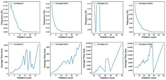 We used the length of theorem sequences required for problem solving as a rough metric for assessing problem difficulty. All annotated and expanded problems have been verified by the solver, and their average solution times varying with problem difficulty are also show in Figure 4. The number of questions with a difficulty level of 15 or higher in formalgeo7k is quite small, leading to significant fluctuations. After data augmentation, datasets exhibited a larger scale of data and a smoother difficulty curve. In general, more challenging problems require longer solving time.