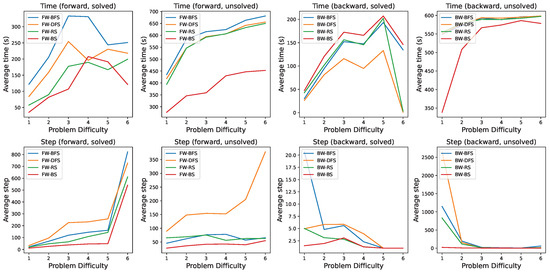 Regarding the search step, forward search statistics are based on the number of nodes, while backward search statistics are based on the number of super nodes. Hence, they cannot be directly compared. The search step length in forward search is positively correlated with the difficulty of problems, while in backward search, it is negatively correlated with problem difficulty. The results of backward search are counterintuitive, and this could be because, for higher difficulty problems, the super nodes in backward search may contain more nodes, leading to increased time spent traversing a single super node and a reduction in the total number of traversed super nodes. Additionally, it can be observed that the search step length for unsolved problems in backward search is significantly higher than the average step length for solved problems. This is because, compared to forward search, backward search is less likely to halt, and it continues searching even if it misses a potential solution branch.