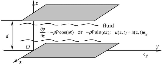 Here, is the fluid density, is the frequency of oscillations and P is constant. At the same time, an external uniform magnetic field of magnitude begins to act vertically to the plates. We suppose that the fluid is finitely conducting, the magnetic Reynolds number is small enough (at least ionized fluids and metallic liquids satisfy this condition []) and there is no surplus electric charge distribution. Consequently, the induced magnetic field and Joule heating can be neglected. In addition, the Hall effects are neglected due to moderate values of the Hartman number. Since the plates are unbounded, the velocity vector corresponding to the resulting flow is given by the next relation [,,]: