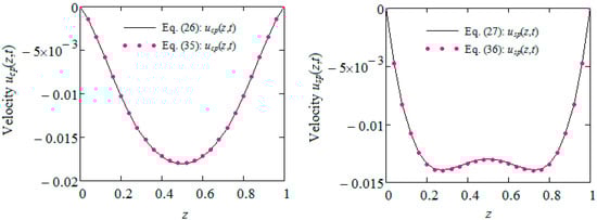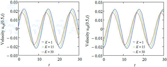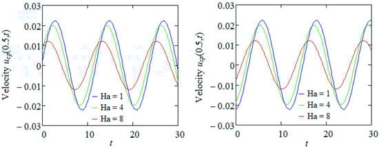 The variations in time of the steady-state velocities and given by Equations (26) and (27) at the middle of the channel are together depicted in Figure 7 and Figure 8 at distinct values of the Hartmann number Ha and porous parameter K. In each instance, the phase difference and the oscillatory behavior of the two motions are easily visualized. Moreover, as expected, the amplitudes of oscillations are identical for motions due to cosine or sine oscillations of the pressure gradient, and they decline for increasing values of Ha or K. Consequently, the fluid velocity diminishes in the presence of a magnetic field or porous medium. It means that, as we previously mentioned, the fluid moves faster in the absence of a magnetic field or porous medium.