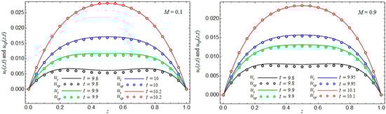 Convergence of starting solution (numerical solution) to given by Equation (27) for for two values of M.