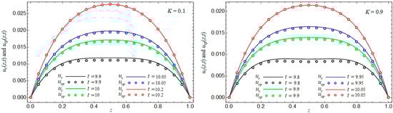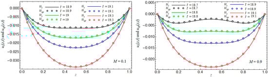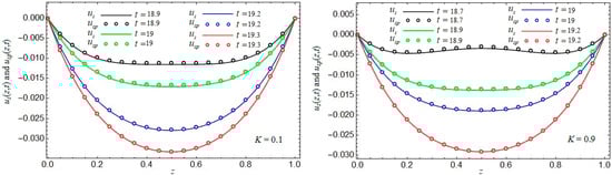 To gain a deeper understanding of the acquired results, Figure 3, Figure 4, Figure 5, Figure 6, Figure 7, Figure 8, Figure 9 and Figure 10 have been prepared for increasing values of time t, distinct values for K and Ha, fixed values of the frequency and of the material constants and : namely, and . Figure 3, Figure 4, Figure 5 and Figure 6, which show the convergence of starting solutions , to their steady-state components , give the time needed to reach a steady state. This is the time after which the diagrams of the starting solutions overlap with those of their steady-state components. From these figures, it also results that the fluid velocity diminishes for increasing values of the parameter M or K. Consequently, the fluid flows slower in the presence of a magnetic field or porous medium. A similar result has been recently obtained by Kulkarni [] for the MHD flow of a water-based hybrid nanofluid about a permeable rotating disk.