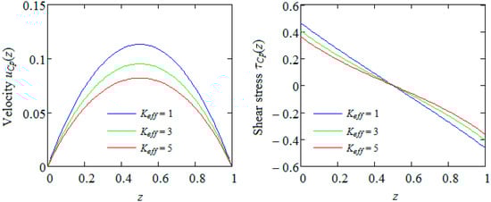 Profiles of the steady-state velocity and of the shear stress are presented in Figure 9 at three values of the effective permeability . The fluid velocity, whose maximum values are touched at the middle of the channel in each case, is a decreasing function with regard to this parameter.