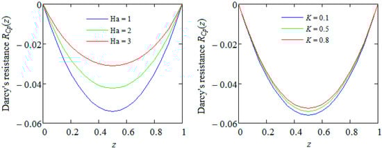 Profiles of the Darcy’s resistance given by Equation (47) for and three values of Ha and for and three values of K.