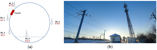 A total of five 5G-R-dedicated network base stations were built along the loop, equipped with base station equipment from multiple manufacturers, to achieve full coverage of the 5G-R dedicated network, supporting railway characteristics such as strip-shaped coverage, redundant networking; moreover, the frequency band is 2100 MHz (1965–1975 MHz/2155–2165 MHz, FDD), defined as n1 by 3GPP, as mentioned in the introduction session. Locations of on-site equipment rooms and base station towers are shown in Figure 3, the locations of the five 5G-R base stations are K0.5, K1.1, K4.2, K6.0 and K7.1, respectively.