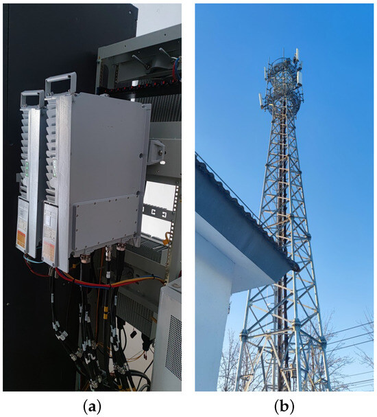 Locations of on-site equipment rooms and base station towers. (a) Locations of 5G-R Base Stations. (b) On-site equipment room and base station tower.