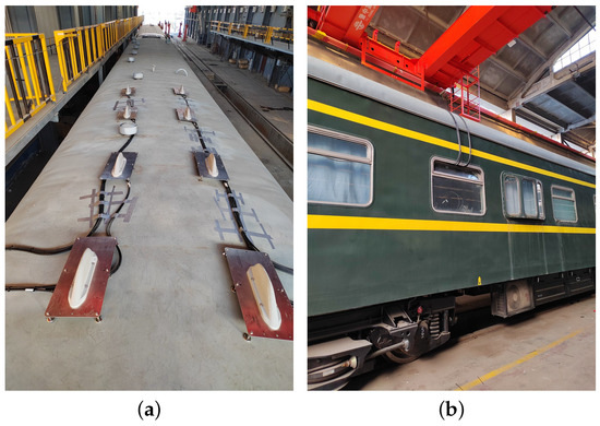 Testing locomotive and roof antenna. (a) Roof antenna. (b) Feeder installation.