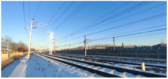 The terrain of our test environment can be classified as a rural area, with trees and sparse low buildings around; moreover, specific railway objects are present in our scenario, such as the low partition wall along the railway, as well as catenary poles, as shown in Figure 9.