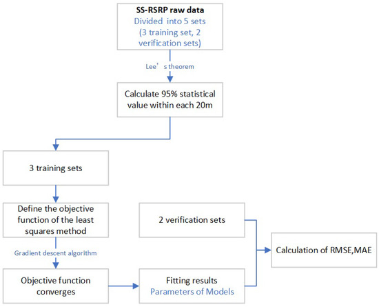 The SS-RSRP of base station K4.2, which represents the scenario of RRU mounted on the tower, is collected as the testing locomotive runs from K4.2 towards K1.1 on the test line of loop railway, and five sets of measurement data are collected during the testing as the locomotive runs for five laps, three sets of which are used as the training sets, whilst the other two sets are used as the verification sets. By adopting the least squares method, the training datasets are used to optimize the three formulas of the corresponding models of FI, CI and TR38.901, and the objective functions for each formula is constructed. By using the gradient descent algorithm, the corresponding objective functions serves to optimize the chances of obtaining optimal formula parameters. By using the verification datasets, the and of the three formulas are calculated which serve to make the comparison of the fitting effects of different models on mainline railway 5G-R scenarios. The fitting process is shown as Figure 11.