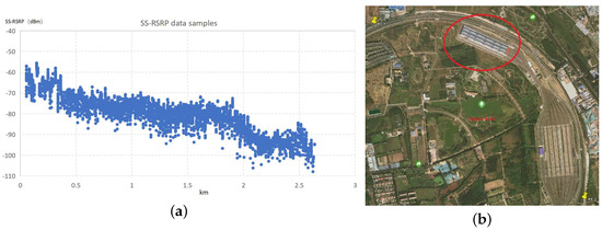 The SS-RSRP raw data are shown in panel a of Figure 12. The horizontal axis represents the distance from the base station K4.2, and the vertical axis represents the power in dBm. After a distance of 1.8 km, the attenuation of received signal power is significant, because there is EMU parking garage, which is a monomer construction with a height of 11 m, and a span of 500 m wide, as shown in the red circle of Figure 12, which blocks the LOS signal. In order to achieve better fitting results, we excluded data from 1.8 km onwards.