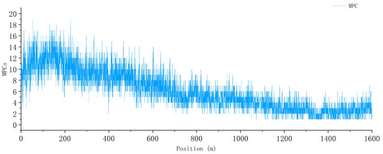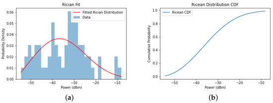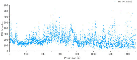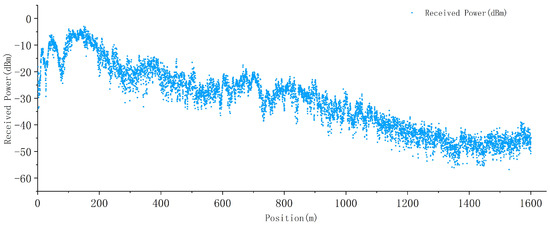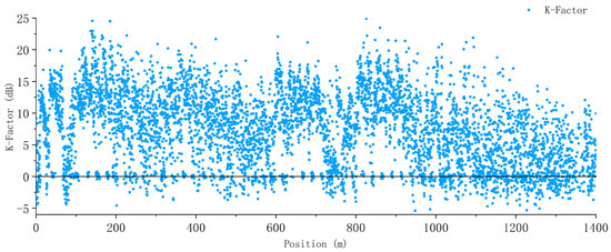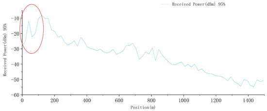 The received signal level is composed of a combination of small-scale fading signals and large-scale fading signals. Therefore, the statistical interval cannot be selected too small, otherwise small-scale fading components cannot be filtered out. According to Lee’s theorem [34], in order to effectively achieve the goal of “eliminating fast fading and preserving slow fading”, the influence of fast fading components on signal statistics should not exceed 1dB, and the statistical interval should be at least 40 . The carrier frequency of our test is f = 2160 MHz, and the statistical interval should be greater than 6 m. In the meanwhile, the statistical interval should not be too large, which results in the loss of statistical information. Taking into account the above factors, the statistical interval is set at 20 m, which means that the 95% value within the interval is taken every 20 m. This not only ensures that the impact of fast fading components on signal statistical values is not greater than 1 dB, but also facilitates characterizing the distribution of the wireless field strength coverage along the railway line.