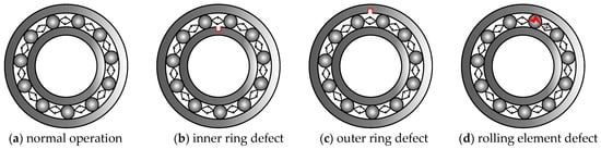 In terms of varying load scenarios, rolling bearing failures can be broadly categorized into four distinct modes: normal operation, inner ring defects, outer ring defects, and rolling element defects, as shown in Figure 1. Each of these modes exhibits varying degrees of degradation. A critical challenge arises because, even within the same mechanical system, different experimental settings often necessitate the use of diverse sampling rates. This inconsistency in sampling rates poses a significant obstacle to the reliable extraction of fault features from rolling bearings under identical fault conditions.