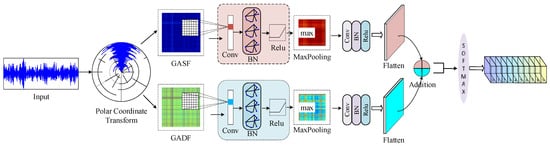 In the context of this study, Figure 2 outlines the architecture of the employed parallel DCNN model. The workflow commences with the preprocessing of input data through a polar coordinate transformation. This transformation, governed by Equation (9), reveals the temporal evolution of phases, encoding valuable information for subsequent analysis. Subsequently, the transformed data undergo further refinement through the computation of the GASF and GADF, as dictated by Equations (10) and (11), respectively. These calculations capture angular relationships and differences within the data, enriching the feature set available to the model. Finally, the enriched data, which are now encoded with both spatial and temporal characteristics, are fed into the parallel DCNN. Herein, the model leverages its parallel processing capabilities to process the data and learn intricate patterns.