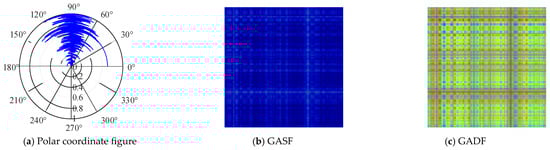 GAF is a methodology that facilitates the transformation of time series data into image-based representations []. This approach not only preserves the integrity of the signal information but also maintains the temporal dependencies inherent in the original one-dimensional sampled sequence. Initially, the GAF resales the time series data within a specified range. Subsequently, each time point’s value is converted into an angular representation by computing the polar coordinates of the rescaled time series. Finally, the GAF derives two distinct fields: the Gramian angular summation field (GASF), which calculates the cosine of the sum of all the angles, and the Gramian angular difference field (GADF), which determines the sine of the same summation. This conversion results in an image where each pixel’s value corresponds to a specific time point in the original data. The advantage of this process is that the resulting images are highly suitable as input for image processing models, such as convolutional neural networks, which were previously inapplicable to time series data in their raw form. First, the rolling bearing fault signal y, obtained under unified sampling rate conditions, undergoes normalization and scaling as follows: